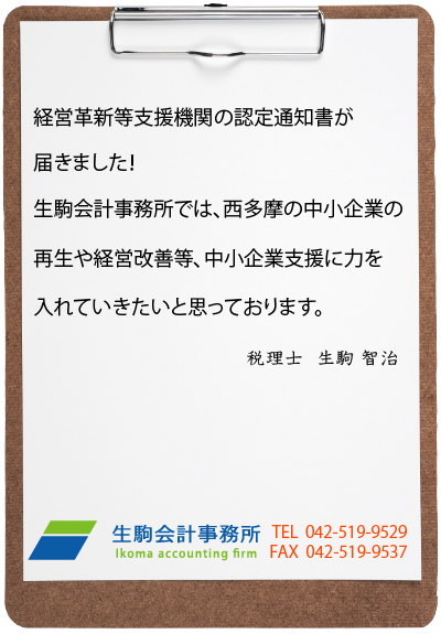 生駒会計事務所の所長の生駒が、中小企業の新たな事業活動の促進に関する法律に基づき、経営革新等支援業務を行う者として認定されました。