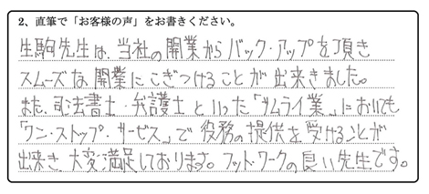 また、司法書士・弁護士といった「サムライ業」においても「ワンストップ・サービス」で役務の提供を受けることが出来、大変満足しております。フットワークの良い先生です。